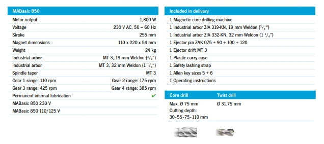 Ample performance with a 1,800 Watt motor. Thanks to the 255 mm stroke, larger parts can also be machined with this magnetic core drilling machine. The MABasic 850 is designed for core drills with a diameter of up to 75 mm and length up to 110 mm. This is an ideal machine drilling twist drill bits up to 31.75 mm diameter with MT3 Shank.