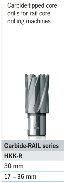 Carbide-tipped TCT Carbide Core drills for rail core drilling machines and for use in drilling of rail steels.