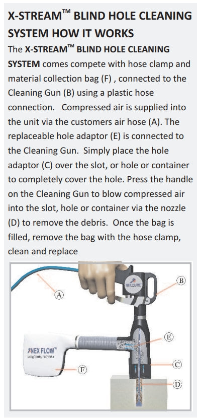 The X-STREAM BLIND HOLE CLEANING SYSTEM is ideal for blowing out and collecting chips, contaminants and debris from deep containers, drilled holes and grooves whereas blow guns can create a potentially hazardous situation with flying debris. The XTM STREAM BLIND HOLE CLEANING SYSTEM creates the ideal blowoff force once the hole adaptor is flush with the hole, directing the unit in such a way to dislodge and direct all the debris into the