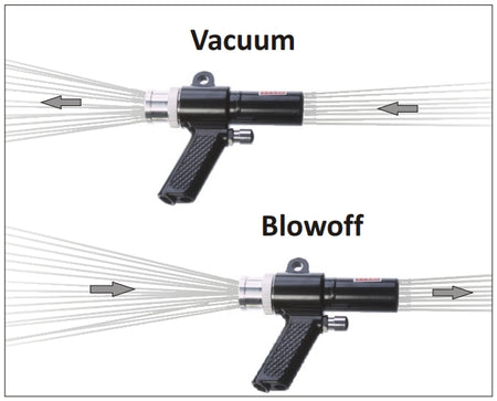 In blowoff mode, the 1-1/4” (32 mm) diameter allows it to cover a much greater area than a small blow gun for faster cleaning and drying. It can also be used to transfer material over a long distance using a vacuum hose which can be supplied. In vacuum mode, it can be used to vacuum up debris if more appropriate than blowing air, and debris can be
