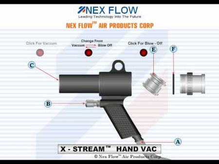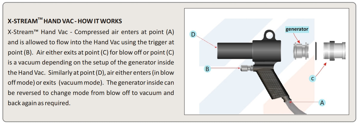 The X-Stream hand vac is the low-cost solution to a variety of industrial housekeeping applications. It is a blow gun, a vacuum gun, a collection system and a transfer system in one
