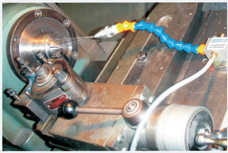cooling that cold air alone cannot provide. The unique low-cost Frigid-X Sub-Zero Vortex Tool Cooling Mist System is ideal for such applications. The unit is comprised of a coolant/lubricant suction system which draws any water based liquid into a specially designed delivery system. This cools the liquid to deliver a very cold fluid “mist” at around 40 degrees F (5 degrees C). This cooling allows for as much as 20% less coolant needed, faster production rates and improved quality.