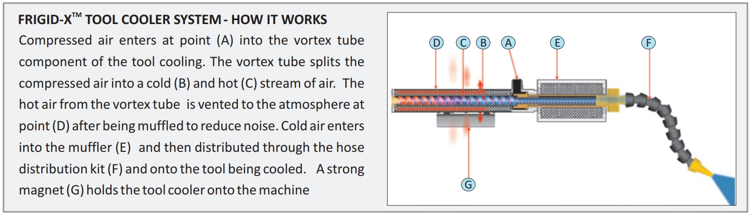 Frigid-X™ Tool Cooling System for dry machining applications - replaces polluting and often toxic mist systems to improve dry machining operations. No mess, no residue and low in cost. It is efficient and can improve dry machining operations and assist in spot cooling applications for a variety of industrial machining processes by increasing machining rates and extending tool life. Produces cold air at approximately 50 F (28 C) below supply air temperature. The unit is muffled for quiet operation. No moving parts assures long life, maintenance-free operation while extending tool life and